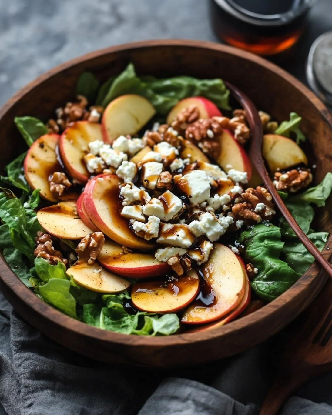 Just before serving, drizzle the Sweet Balsamic Drizzle over the salad. Add the crumbled feta cheese and toasted nuts. Toss gently to coat all the ingredients evenly without bruising the greens or apples. You want every bite to offer that perfect blend of crispness, creaminess, and tang.