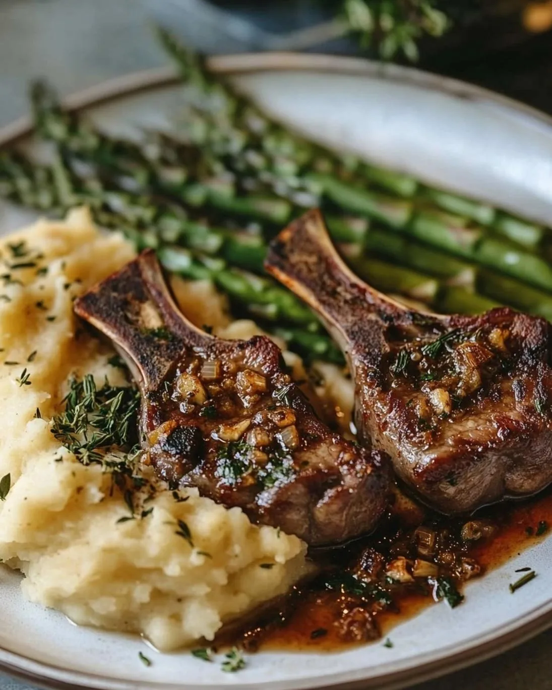 Presenting your Garlic Herb Lamb Chops with Cheddar Mashed Potatoes Roasted Asparagus beautifully enhances the dining experience.